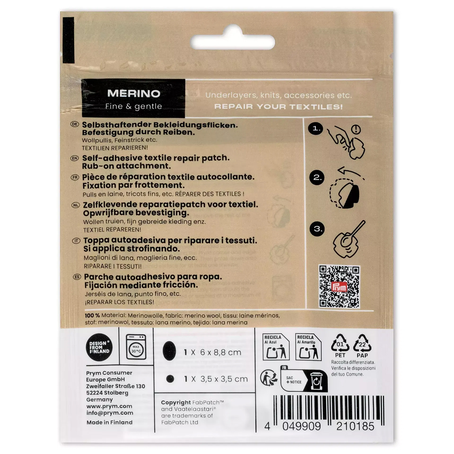 Mit dem Rub-on Patch MERINO von PRYM x Fabpatch reparierst Du empfindliche Strick- und Wolltextilien besonders schonend – ganz ohne Nähen oder Bügeln. Der hochwertige Flicken aus feiner Merinowolle wurde speziell für Feinstrick entwickelt und fügt sich angenehm weich in Deine Kleidung ein.