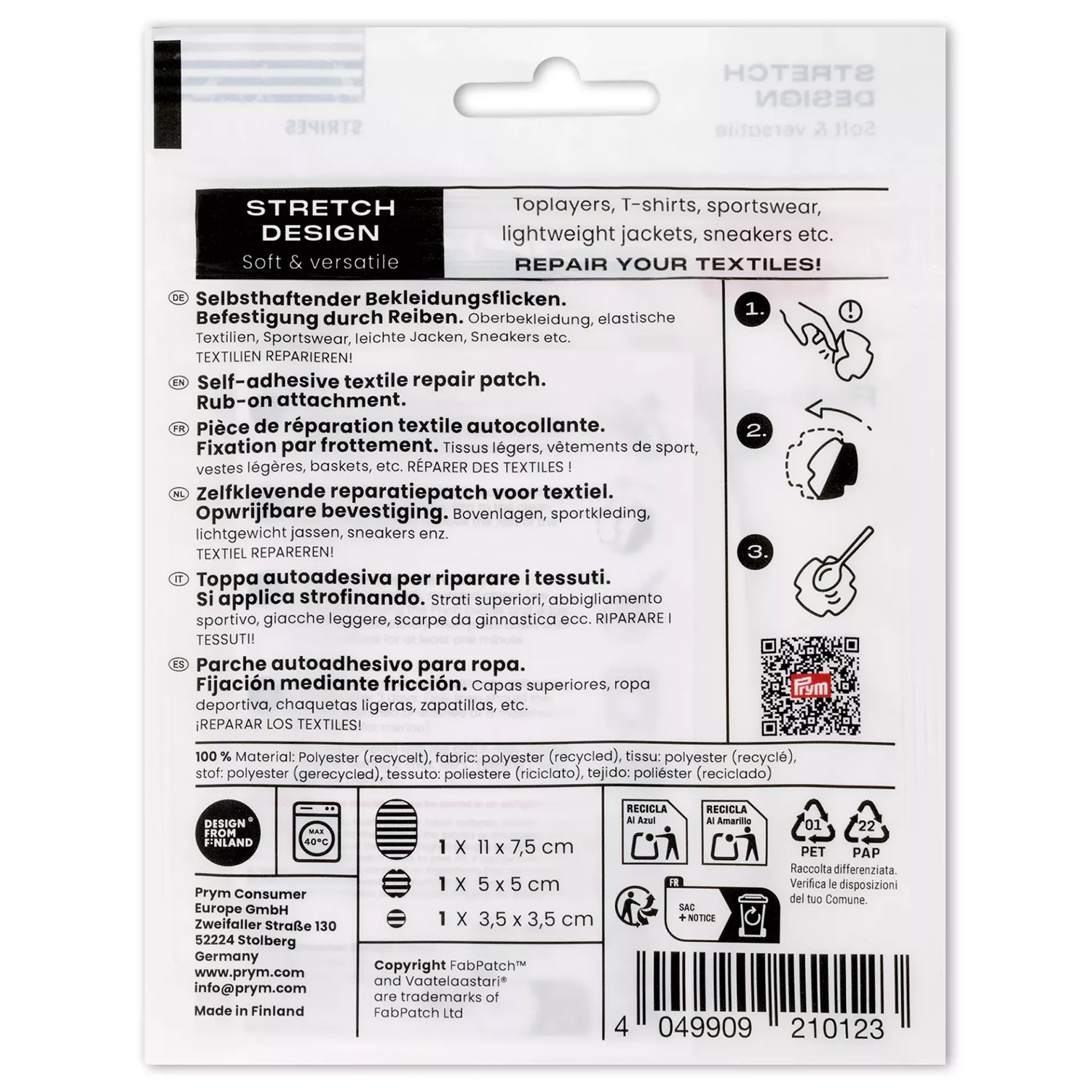 Mit dem Rub-on Patch STRETCH DESIGN von PRYM x Fabpatch reparierst Du Deine Kleidung schnell, unkompliziert und dauerhaft – ganz ohne Nähen oder Bügeln. Der selbstklebende Flicken ist speziell für elastische Stoffe entwickelt und passt sich jeder Bewegung flexibel an.