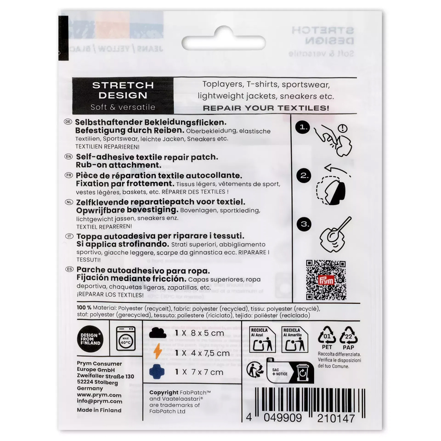 Mit dem Rub-on Patch STRETCH DESIGN von PRYM x Fabpatch reparierst Du Deine Kleidung schnell, unkompliziert und dauerhaft – ganz ohne Nähen oder Bügeln. Der selbstklebende Flicken ist speziell für elastische Stoffe entwickelt und passt sich jeder Bewegung flexibel an.