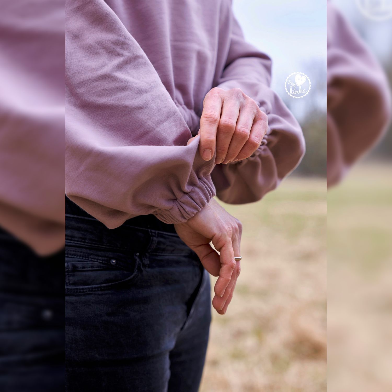 Durch die vielen Varianten kann Brunhilde ebenso zum schlichten Basic-Pullover mit Lieblingsteil-Garantie werden. Die extra weiten Ärmel? Die kannst du entweder stylish mit einem Gummiband gerafft oder klassisch mit Bündchen bändigen. Und auch der Halsabschluss kann ganz nach deinem Geschmack gewählt werden – zwischen Bündchen, Beleg und Kragen hast du die Qual der Wahl. Es sind sowohl eine kurze (Cropped-)Länge als auch eine normale Basic-Länge enthalten!