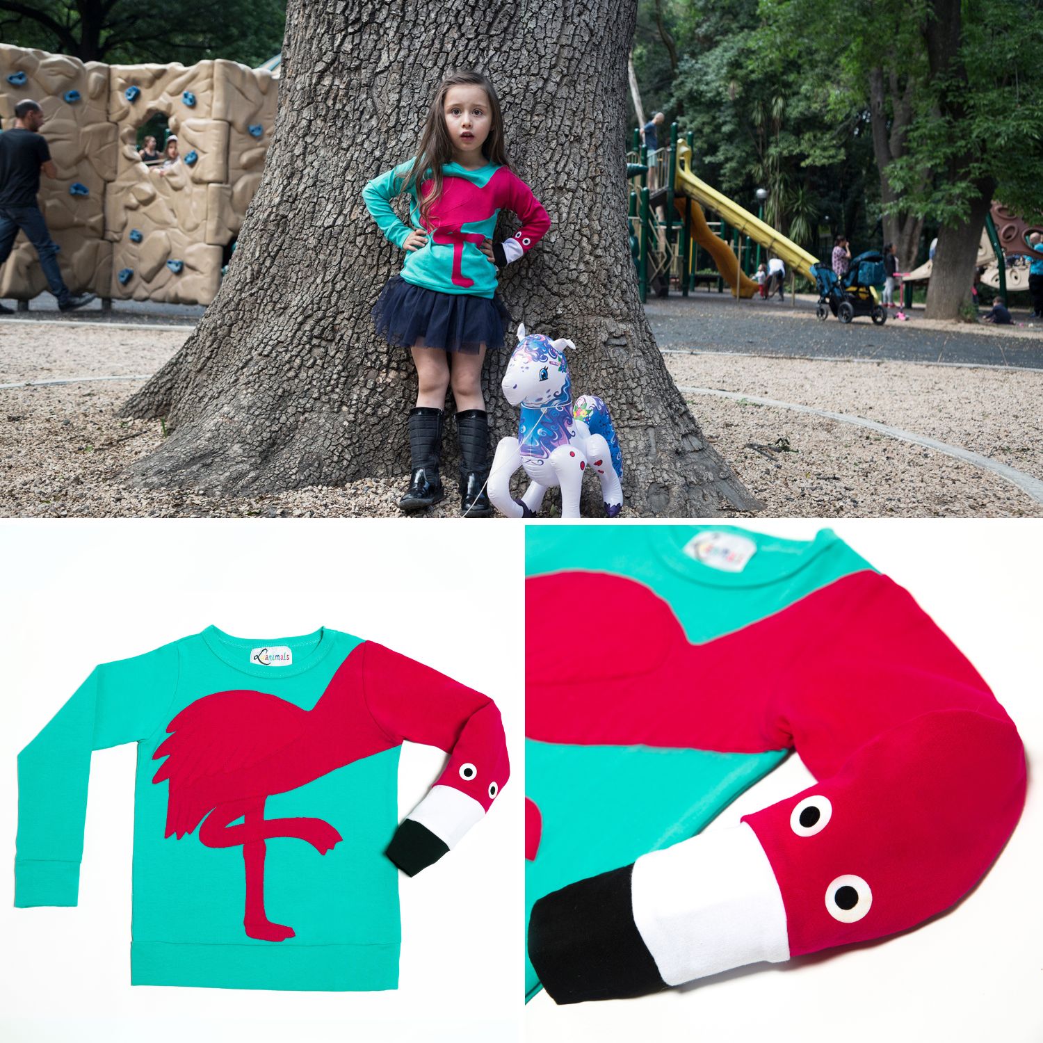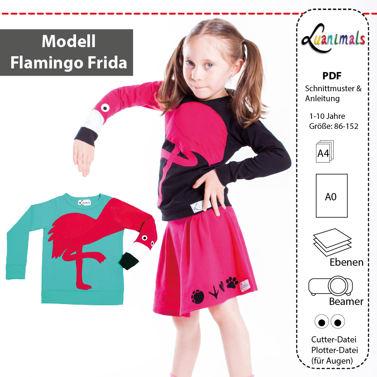 Mit unserem digitalen Luanimals Schnittmuster eBook Flamingo Frida kannst du ganz einfach einen einzigartigen Flamingo Pullover für Kinder im Alter von ca. 1 bis 10 Jahren nähen. In diesem Rundum-Paket ist alles enthalten, was du für dein nächstes kreatives DIY-Projekt brauchst.