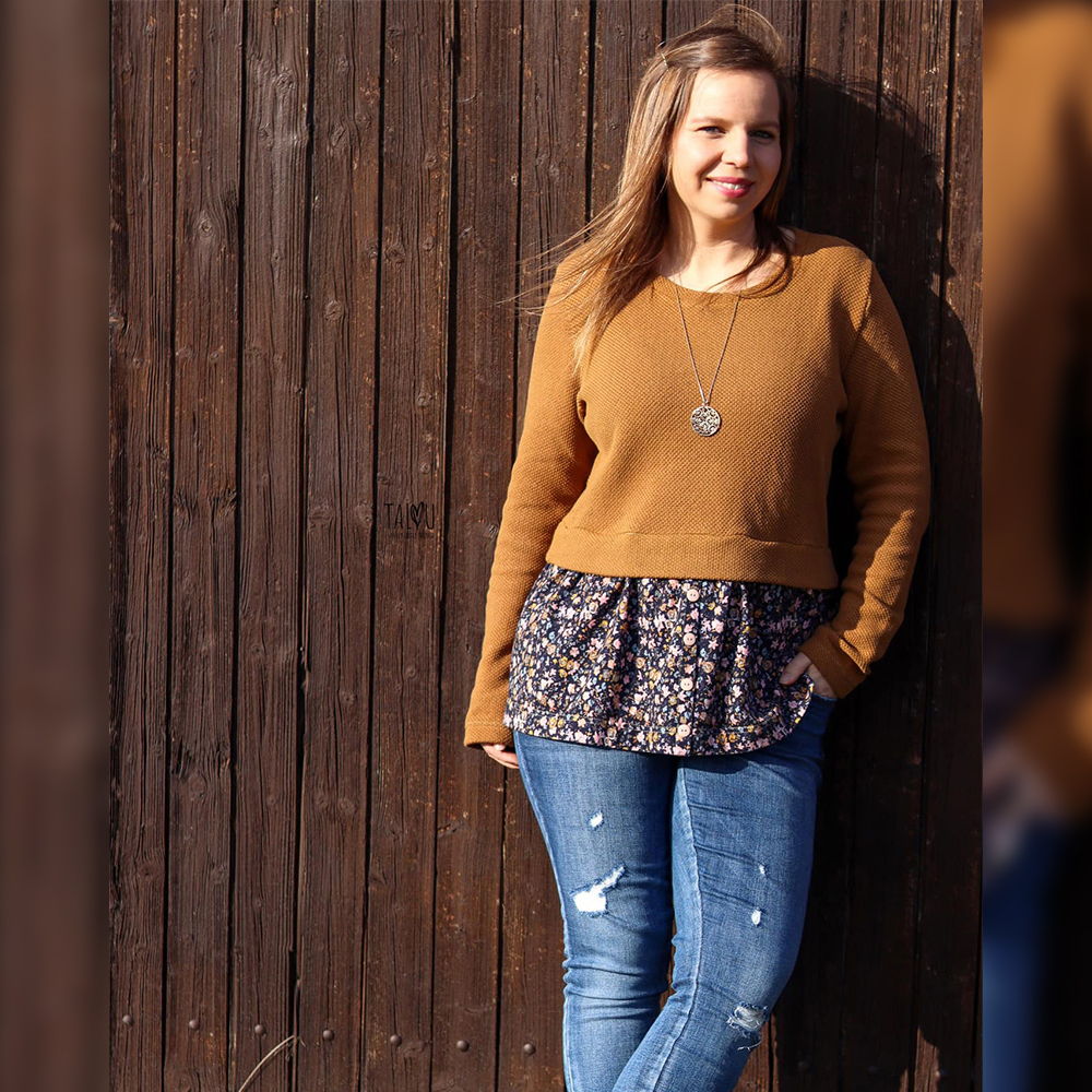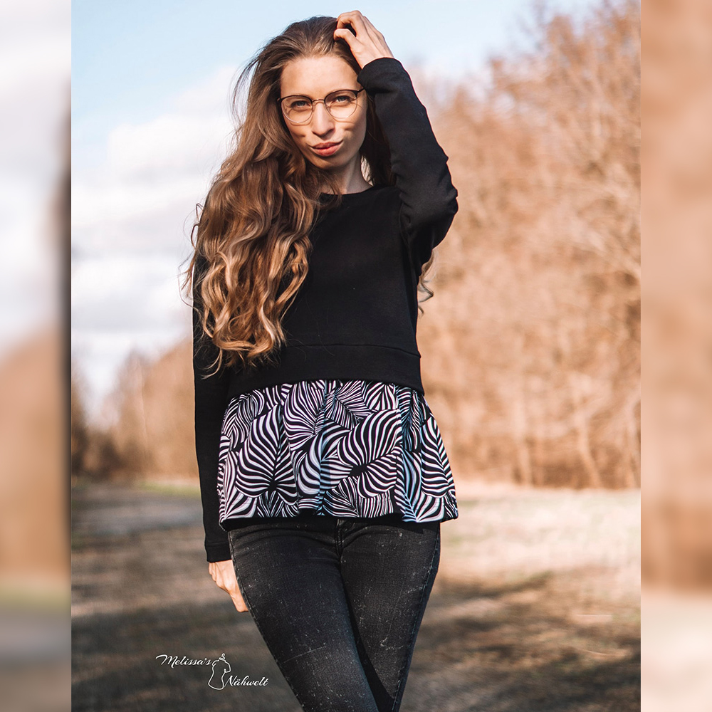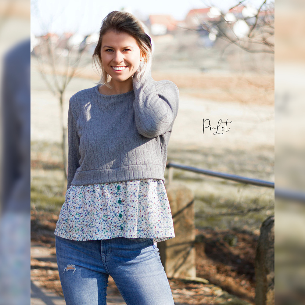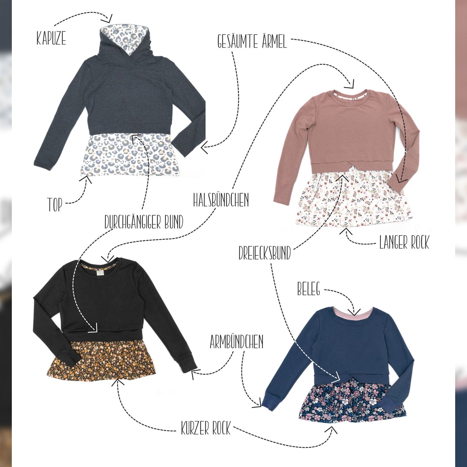 Der Girly Sweater ist für elatische Stoffe gemacht. Am besten eignet sich Sommersweat bzw. French Terry für das Oberteil. Das Rockteil kannst du sowohl aus Jersey als auch aus Webware nähen. Für das Top eignet sich ebenfalls Jersey am besten. Die Armbündchen müssen aus Bündchenstoff genäht werden.