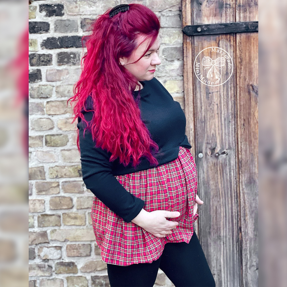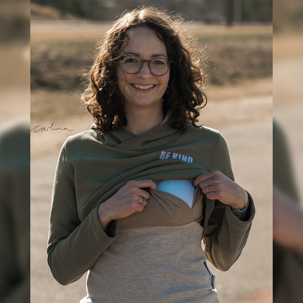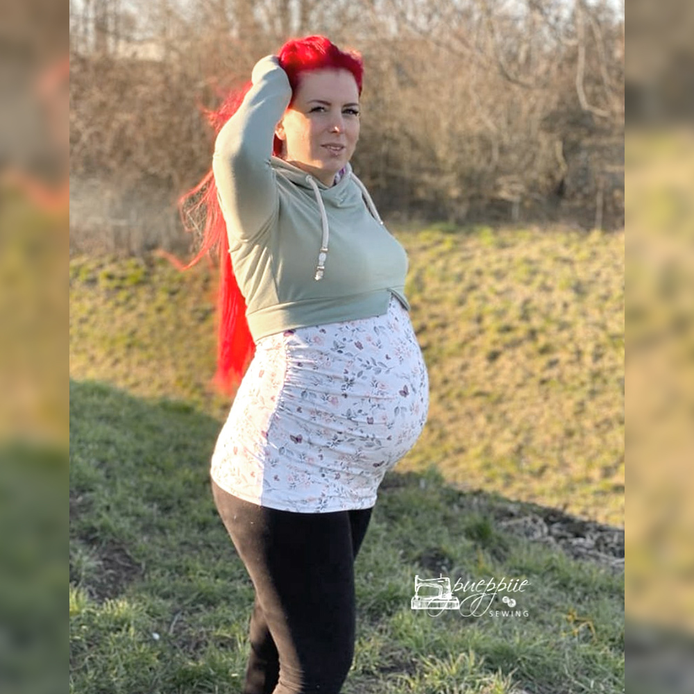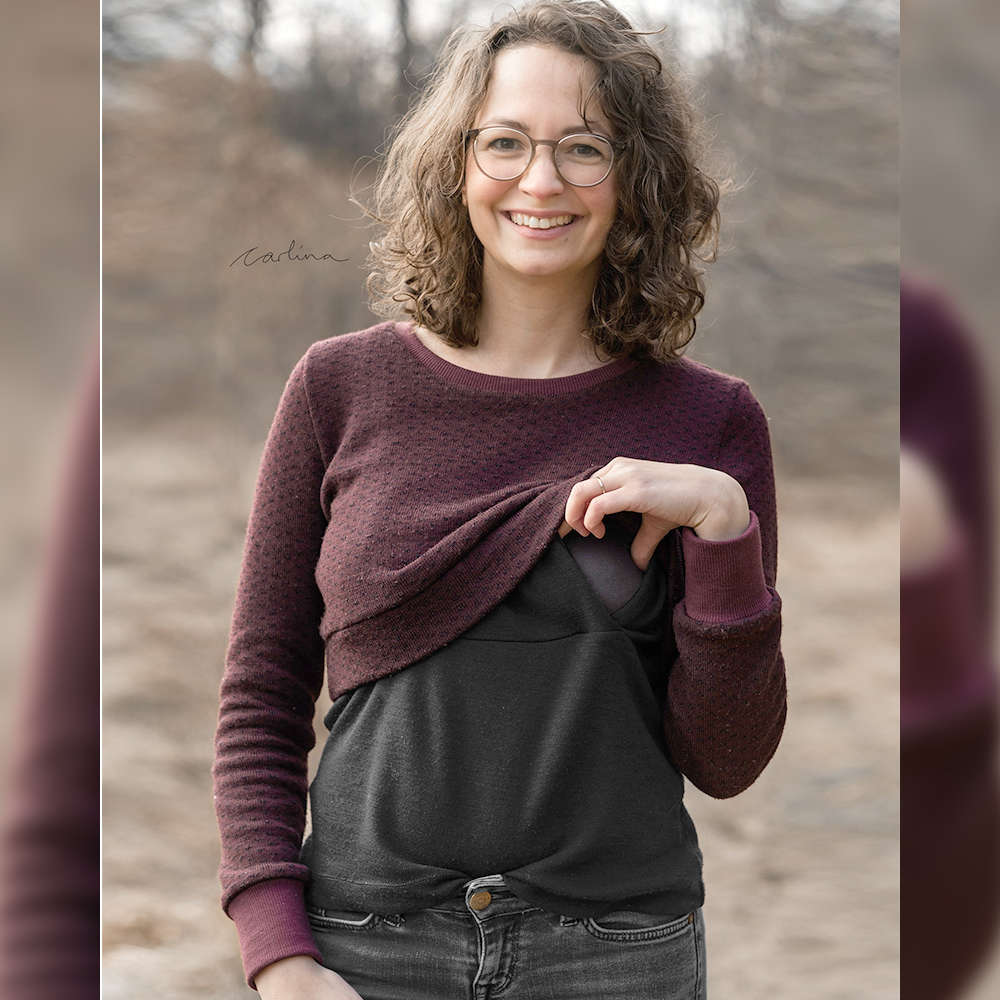 Der Girly Sweater ist ein etwas lockerer geschnittener Pullover im Cropped-Look. Du hast die Wahl zwischen Kapuze, Halsausschnitt mit Beleg oder Bündchen, kurzem und langem Rockteil, Umstandsrock, Umstandstop oder klassischem Top und gesäumten Ärmeln oder Armbündchen. Die Stillfunktion ist optional.