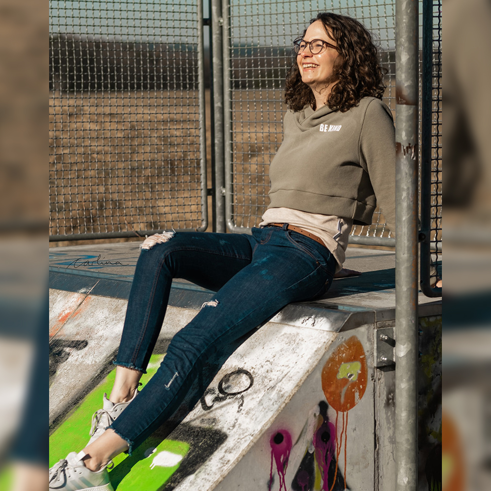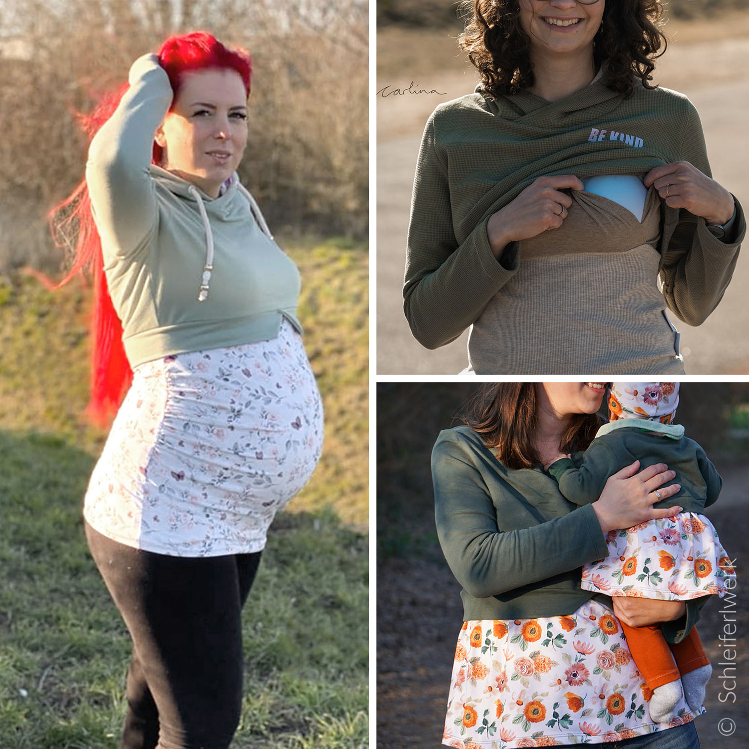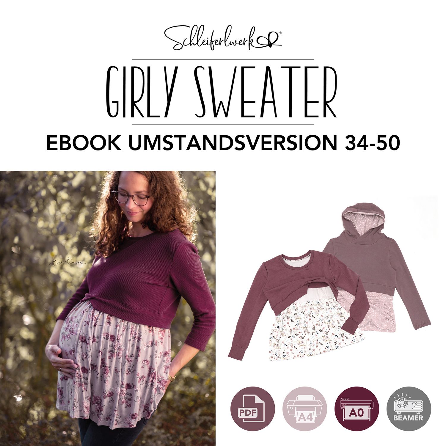 Der Girly Sweater ist ein etwas lockerer geschnittener Pullover im Cropped-Look. Du hast die Wahl zwischen Kapuze, Halsausschnitt mit Beleg oder Bündchen, kurzem und langem Rockteil, Umstandsrock, Umstandstop oder klassischem Top und gesäumten Ärmeln oder Armbündchen. Die Stillfunktion ist optional.