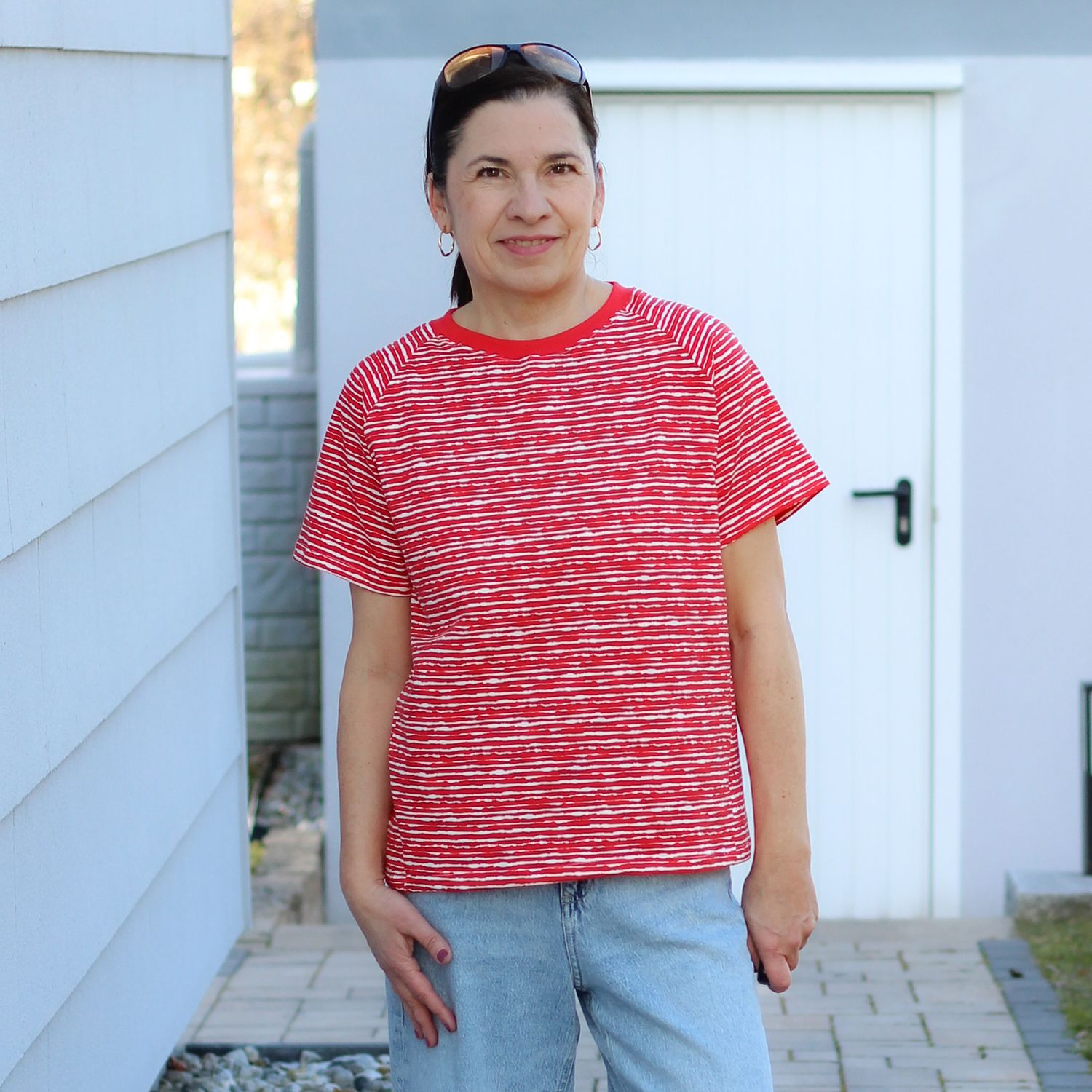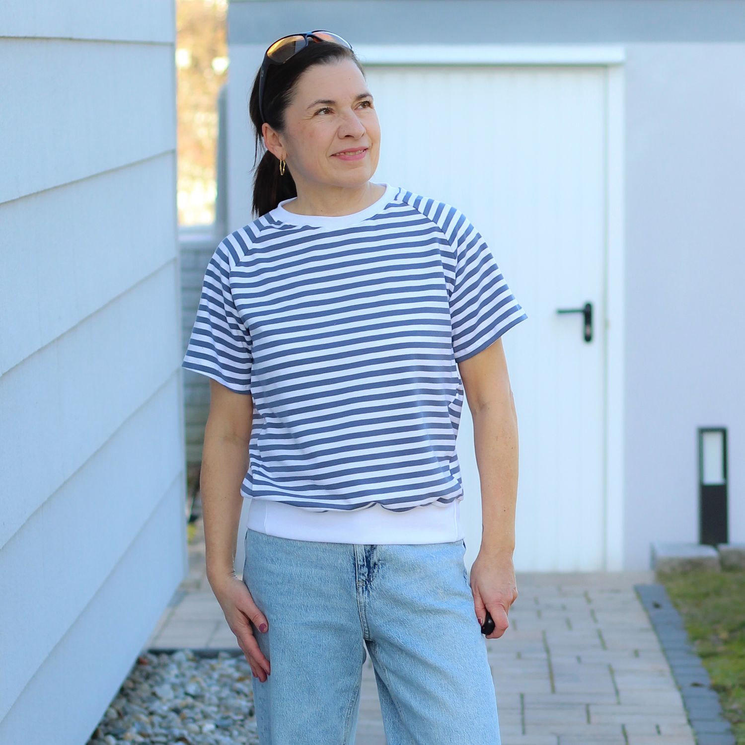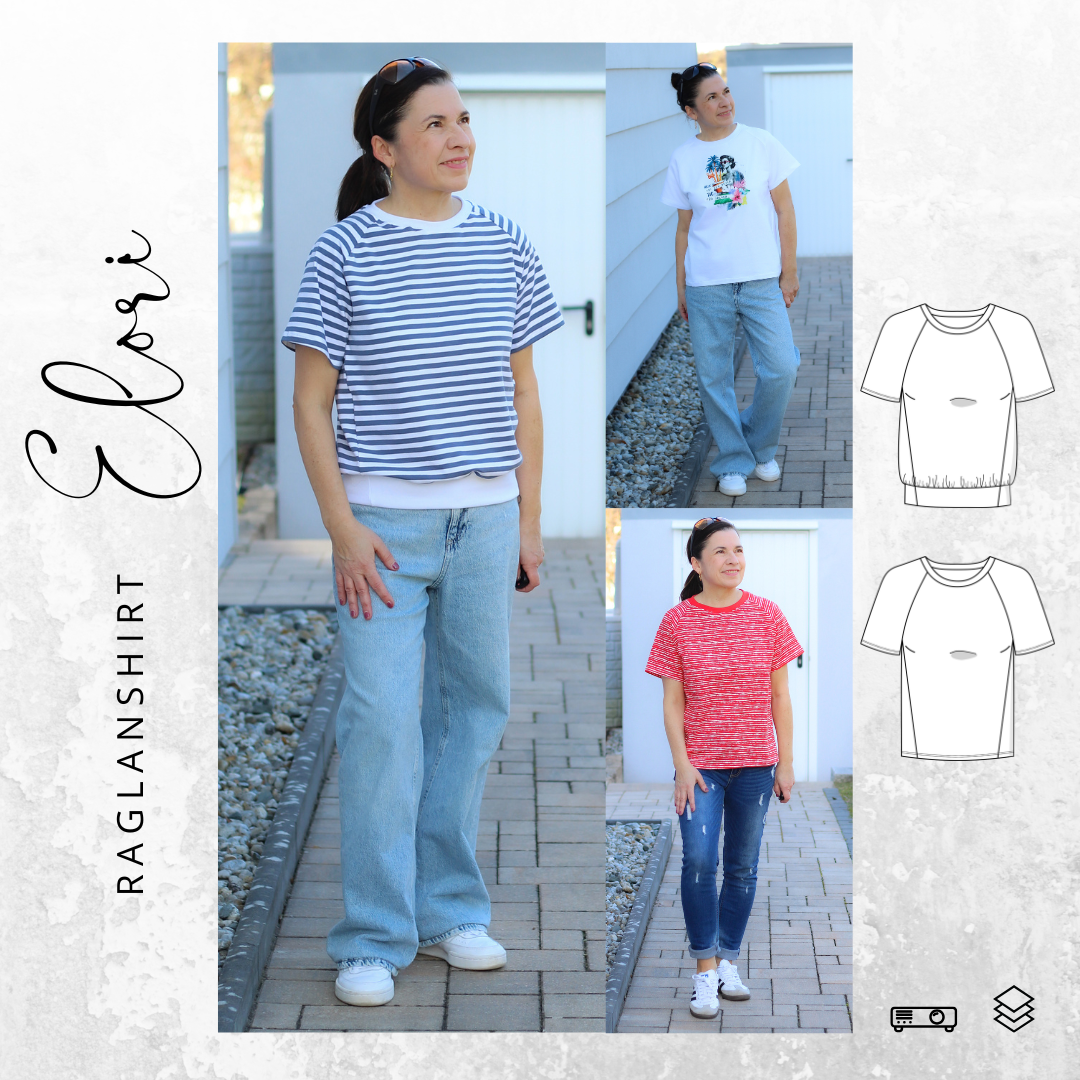 Raglanshirt ELORI – modernes Schnittmuster für Damen (Gr. 32–56). Vielseitiger Schnitt mit moderner Passform und raffinierten Details. Drei Längen für Körpergrößen von 1,58 m, 1,68 m und 1,78 m sorgen für optimalen Sitz. Die besondere Seitennaht verläuft ins Vorderteil und schafft einen modernen Look. Wählbar sind Saum oder Bündchen. Leger, nicht oversized. Ideal für elastische Stoffe wie Jersey oder French Terry – bequem und individuell nähbar.