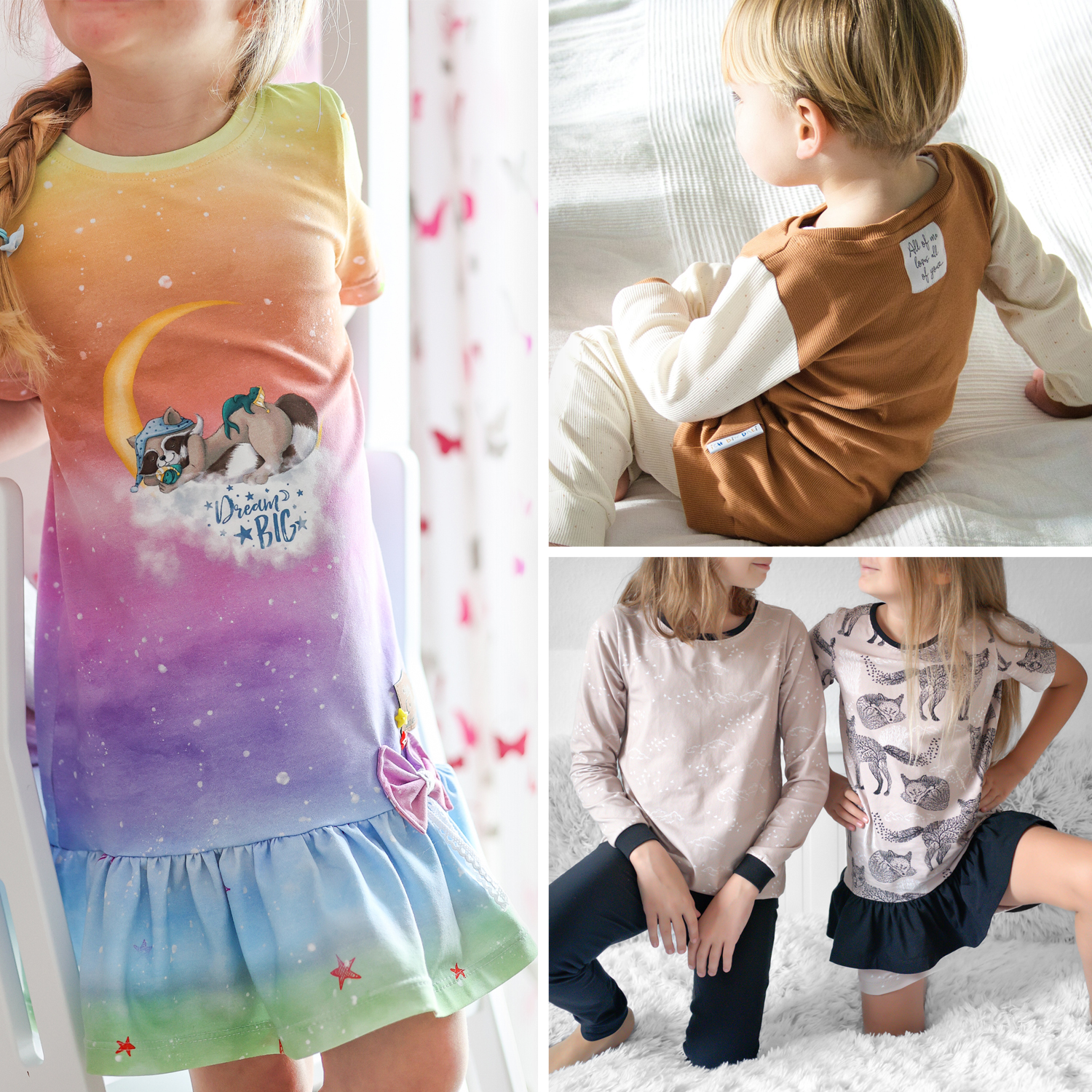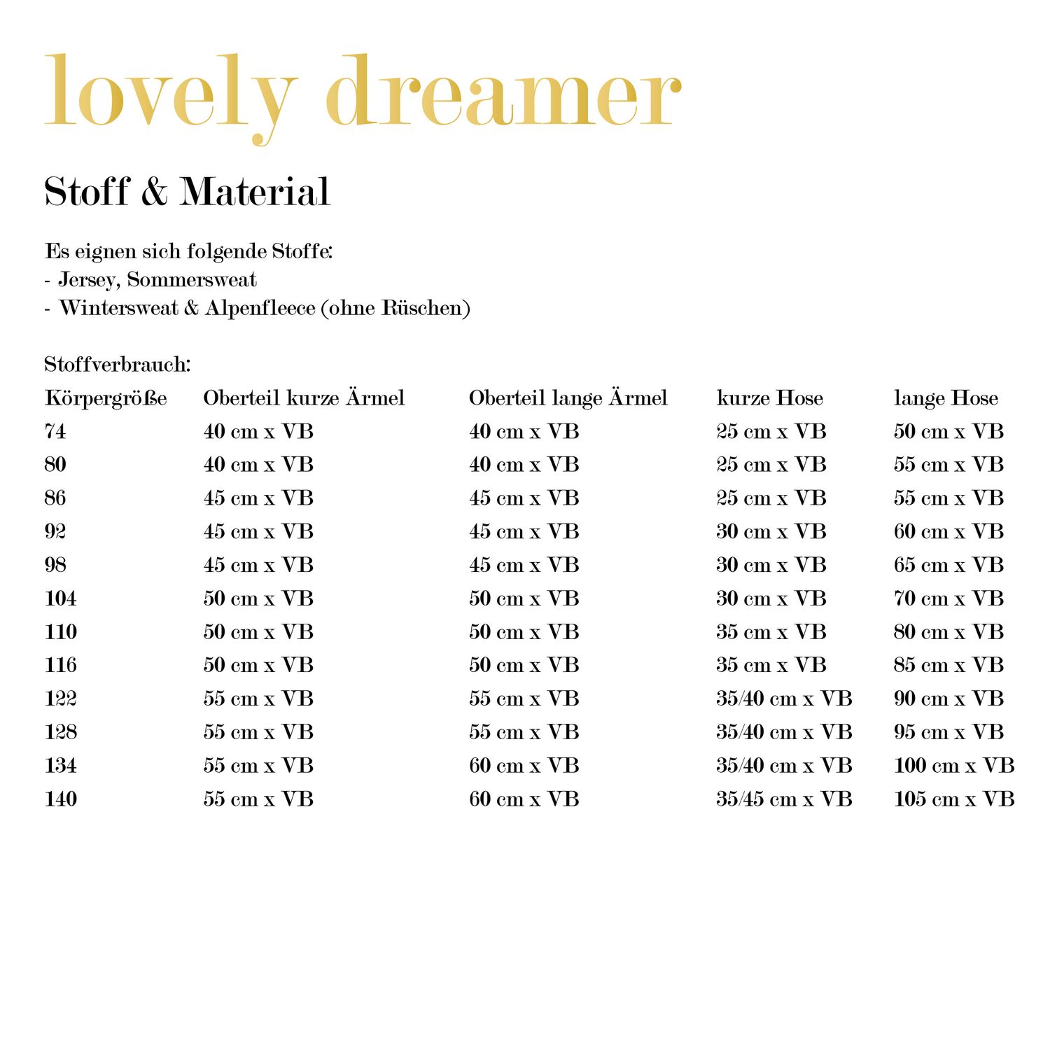 lovely dreamer ist ein lässig geschnittener Schlafanzug, den Jungs und Mädchen vom Kleinkindalter bis ins Schulalter über das ganze Jahr tragen können. Ihr könnt ihn mit allen dehnbaren Stoffen nähen und habt die Möglichkeit zu Säumen oder mit Bündchen zu nähen.
