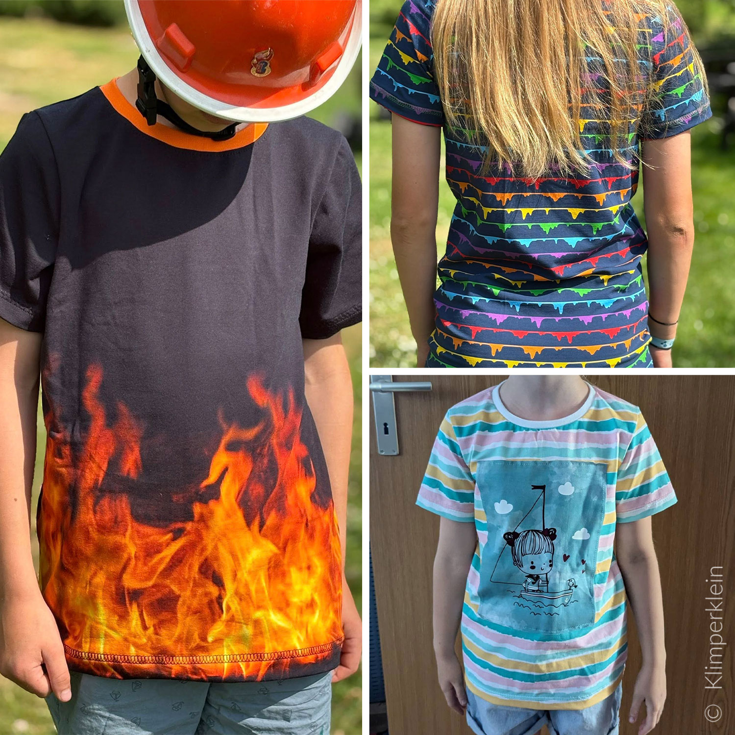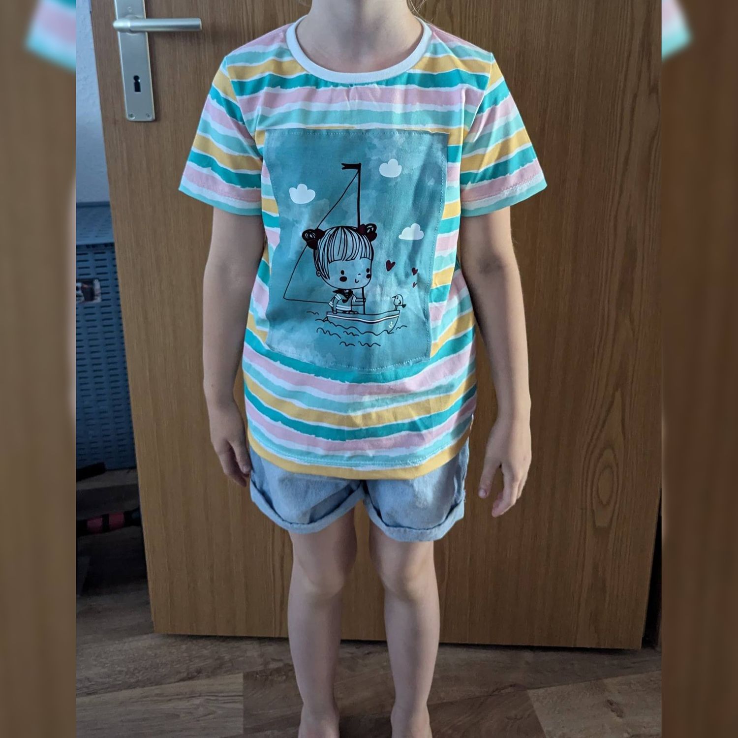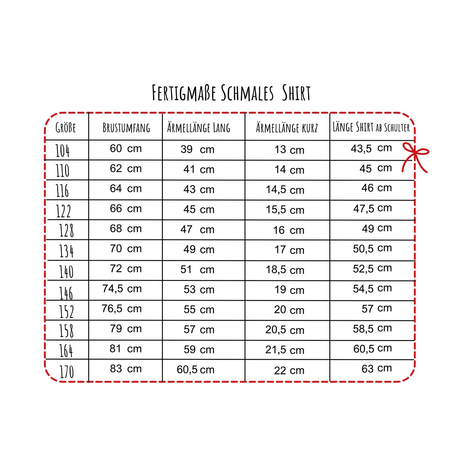 Um deine gewünschte Passform zu ermitteln, findest du die Körpermaßtabelle, die der Konstruktion zu Grunde liegt, in der Bildergalerie. Ebenso kannst du dort die Fertigmaßtabelle des Shirts finden. Miss das Kind oder ein passendes Kleidungsstück aus, um ein Gefühl für die Passform der verschiedenen Shirts zu bekommen. Zur Veranschaulichung habe ich für jedes Shirt eine maßstabsgerechte Passformgrafik erstellt, die am Beispiel von Größe 122 zeigt, wie das Shirt an einem Kind, das der Körpermaßtabelle entspricht, sitzt.