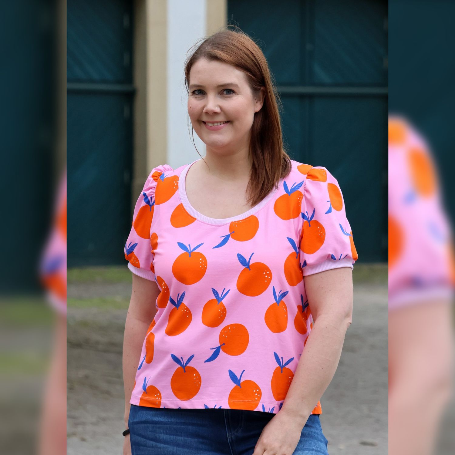 Ida ist ein Schnittmuster für ein lässiges Damen-Shirt mit niedlichen Puffärmeln für dehnbare Stoffe wie Jersey.