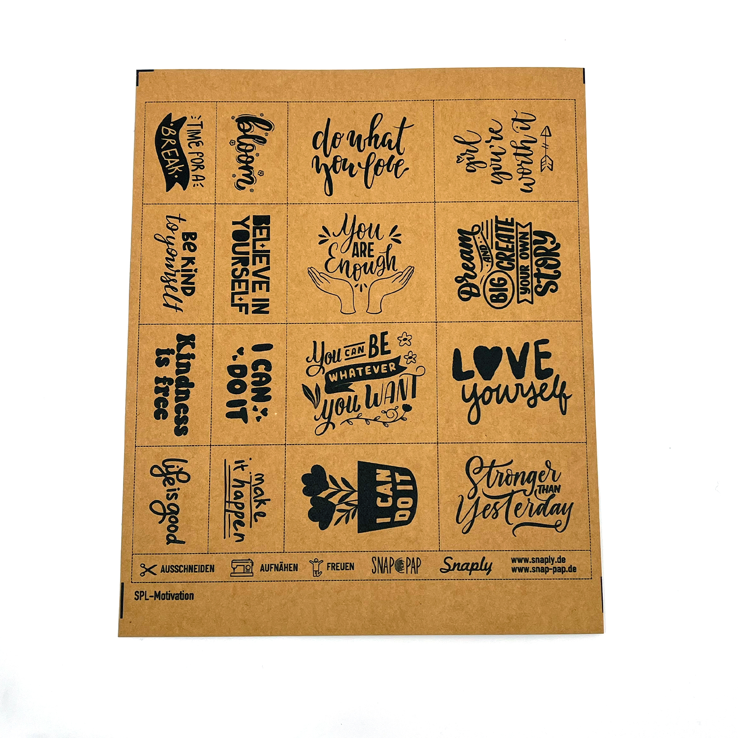 Ein Bogen mit SnapPap Label für den Extra Kick an Motivation für alle Lebenslagen. Mit den Labels verleihst Du Deinem Nähprojekt einen persönlichen Touch, Schneide sie einfach aus, nähe sie auf Dein Projekt und freue Dich über ein ganz besonderes Einzelstück!