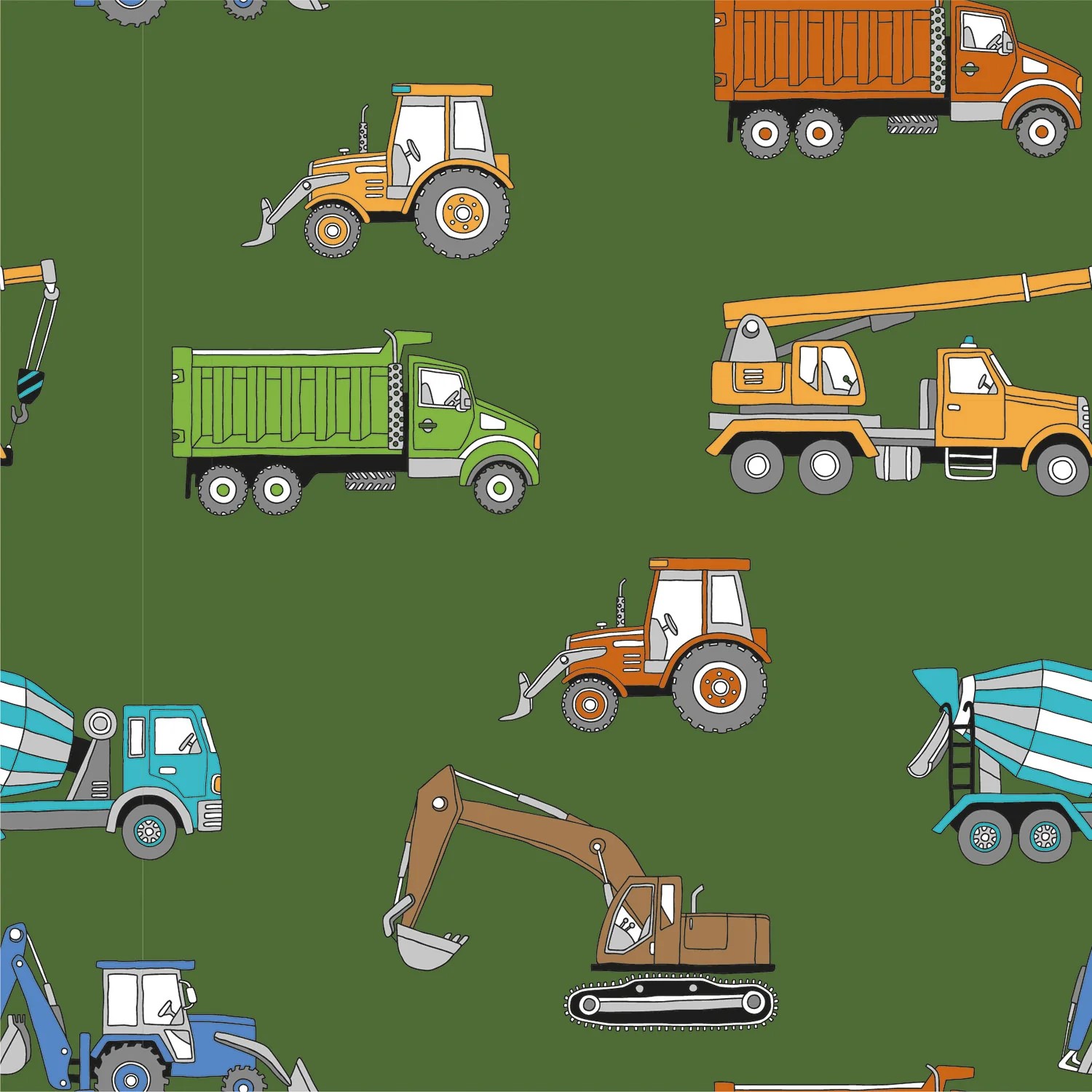 Sommersweat French Terry - Baufahrzeuge auf Grün