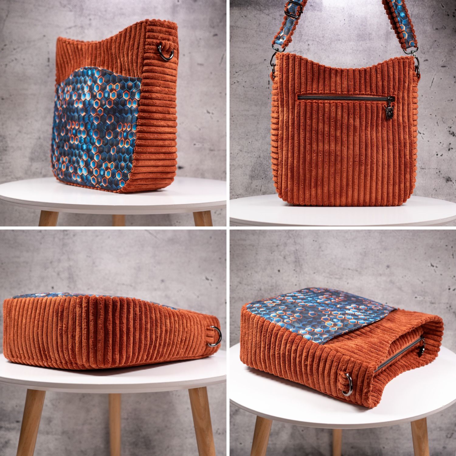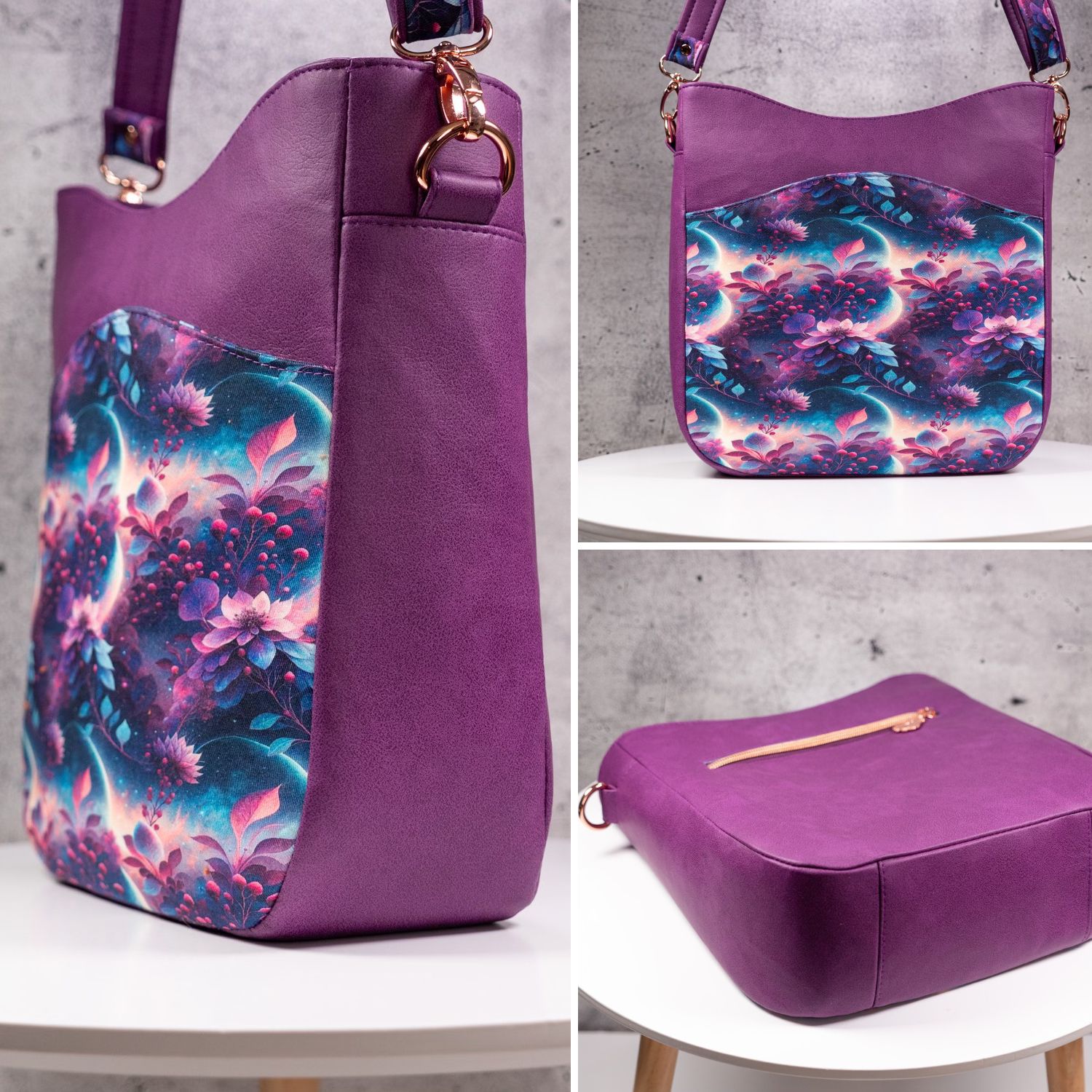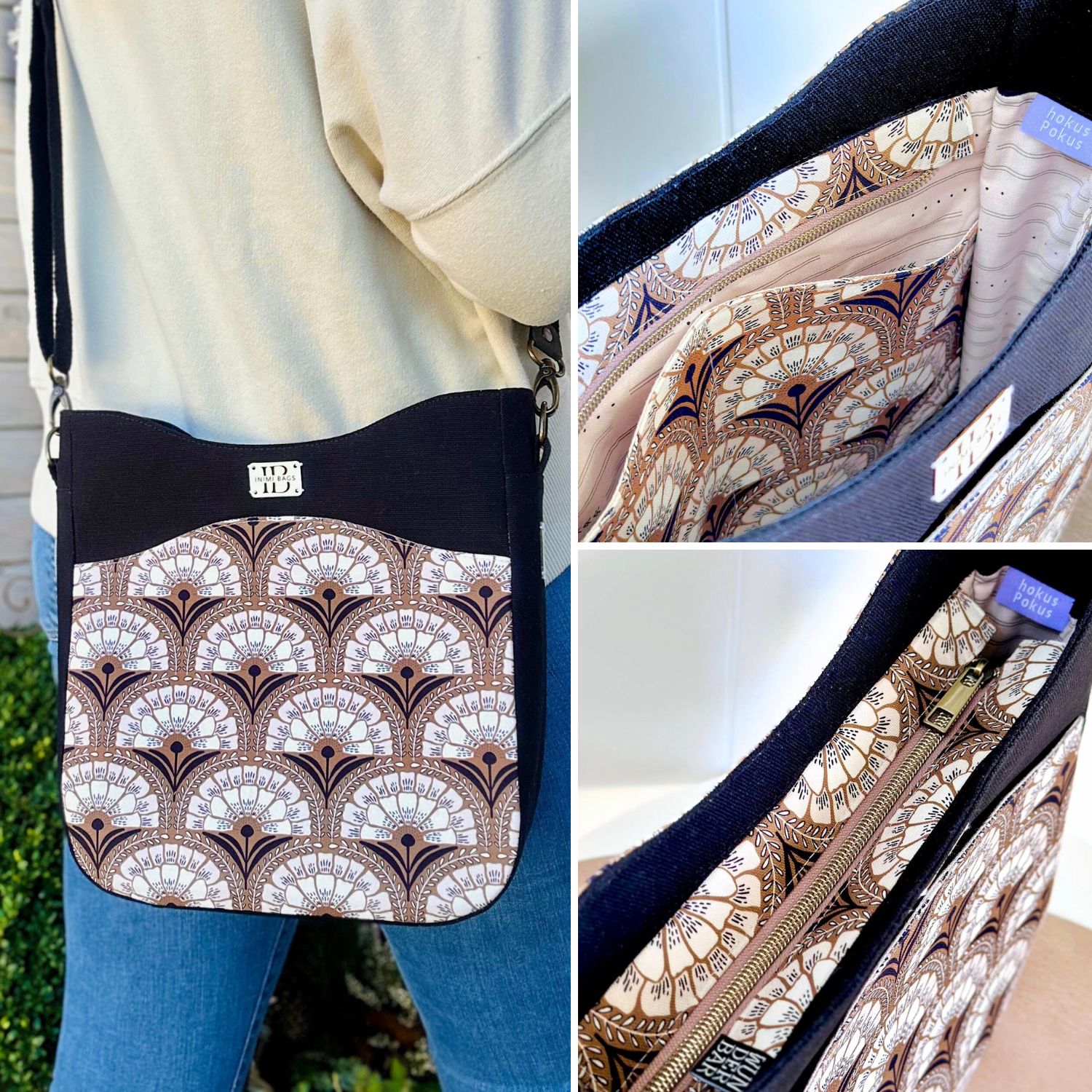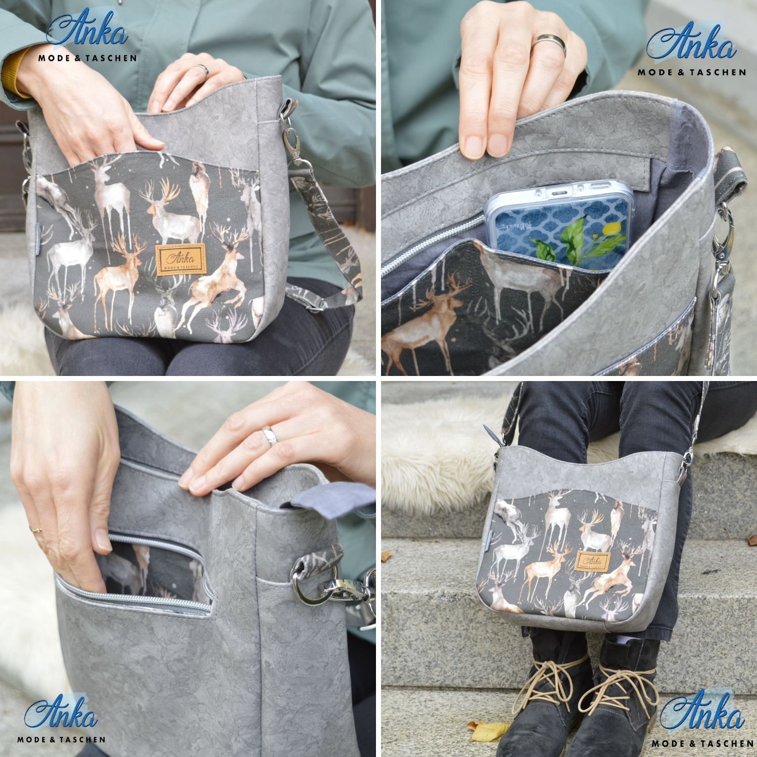 Die Umhängetasche Sarah ist ein kreatives Nähprojekt für alle, die elegante Details lieben. Mit 25 cm Breite, 27 cm Höhe und 9 cm Tiefe, die sich nach oben hin verjüngt, hat sie die perfekte Größe für den Alltag. Besonders charmant ist die geschwungene Linienführung. Der Reißverschluss sitzt etwas tiefer, wodurch die Form noch spannender wirkt. Auf der Vorderseite sorgt ein schön geschwungenes Steckfach mit Magnetknopf für das gewisse Extra, während das praktische Reißverschlussfach auf der Rückseite zusätzlich Stauraum bietet. Sarah ist die ideale Tasche, um mit Stoffen zu spielen und deine eigene kreative Handschrift einfließen zu lassen – romantisch, klassisch oder ausgefallen.