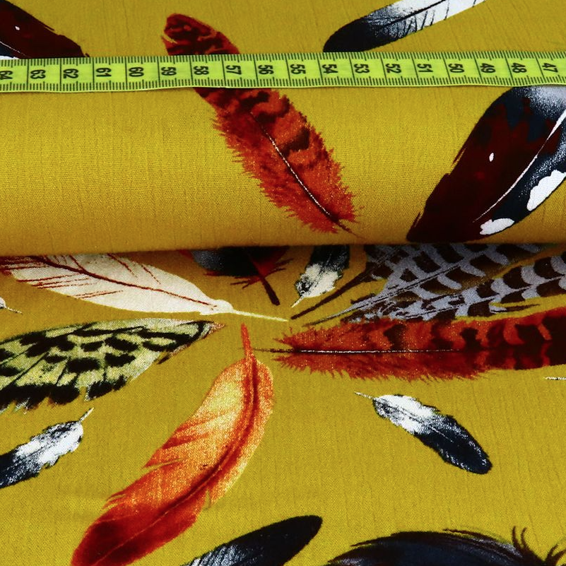 Viskose Blusenstoff Bunte Federn auf Senfgelb