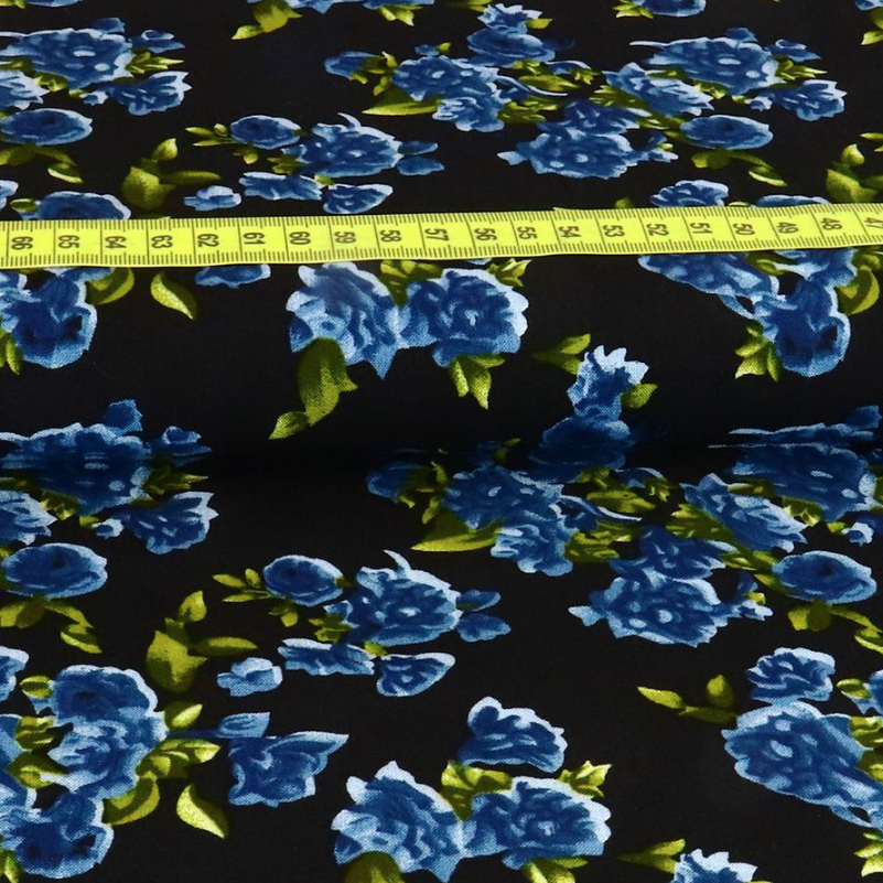Viskose Blusenstoff Flowers Blau auf Schwarz