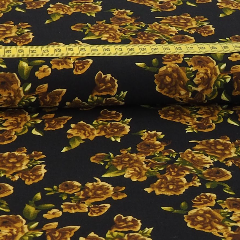 Viskose Blusenstoff Flowers Senfgelb auf Schwarz