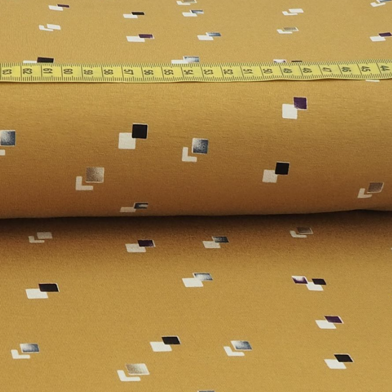 Viskose Jersey Geo Quadrate auf Senfgelb
