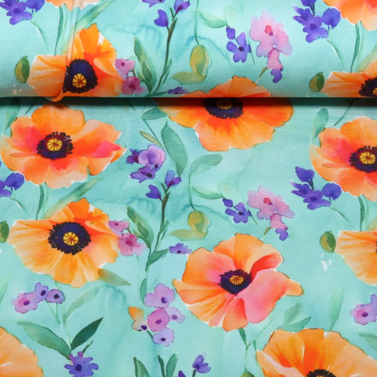 Viskosejersey - Digital Mohnblumen Türkis