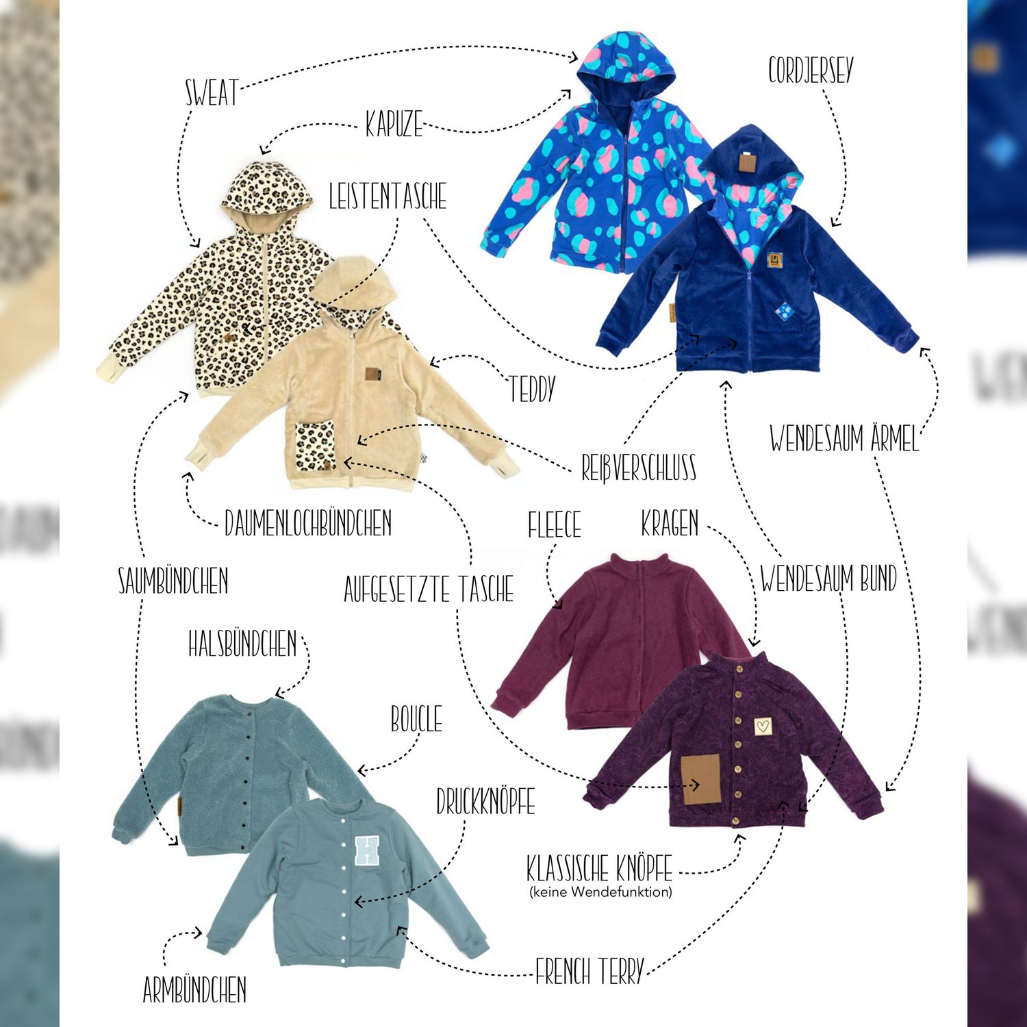 Die Cozy Twist Wendejacke ist für viele Stoffarten geeignet. Wichtig ist, dass die Stoffe leicht elastisch sind und zumindest einer der beiden Stoffe nicht zu labbrig ist. Teddystoff, Fleece, French Terry, Sweat oder Cordjersey eignen sich super dafür. Für die Bündchen empfehle ich dir Bündchenware zu nutzen.