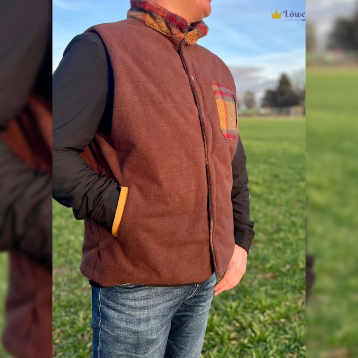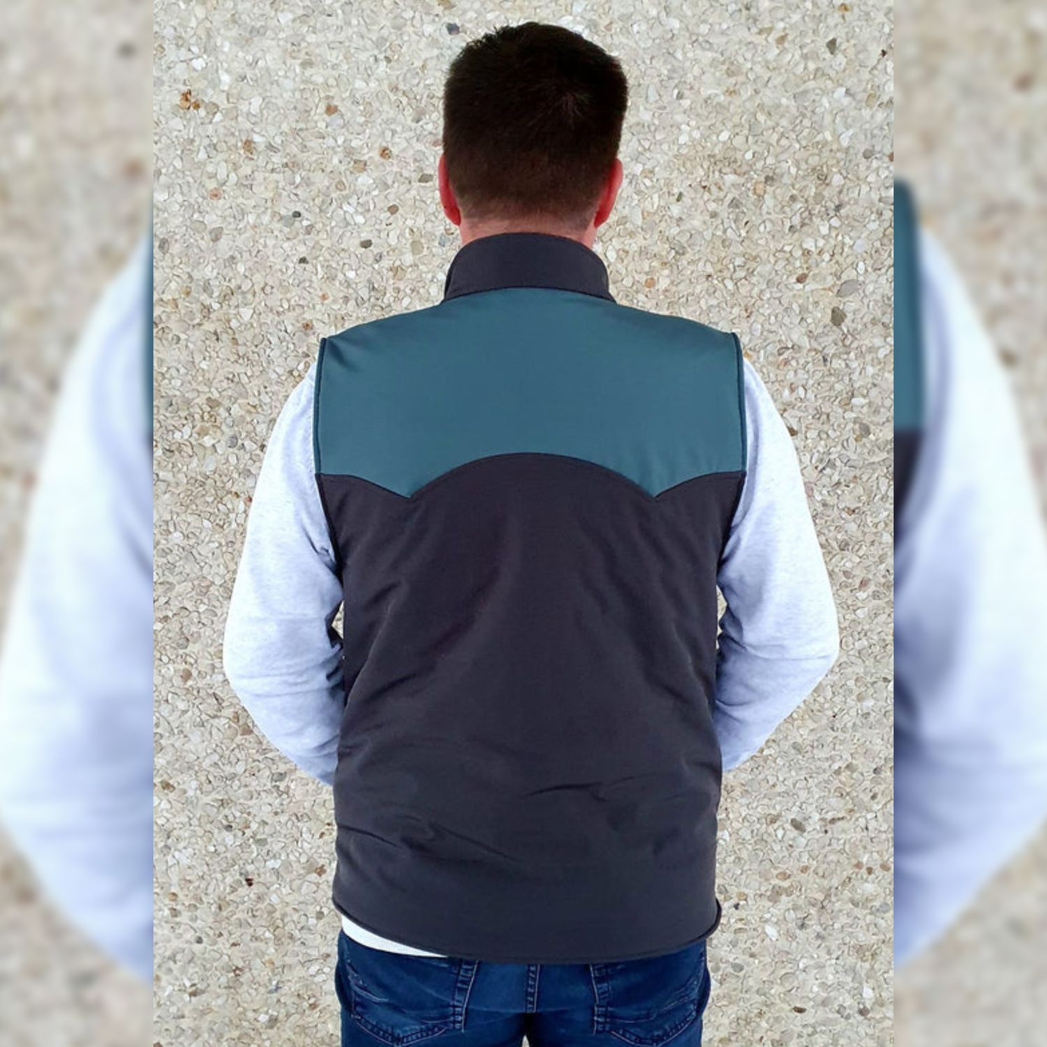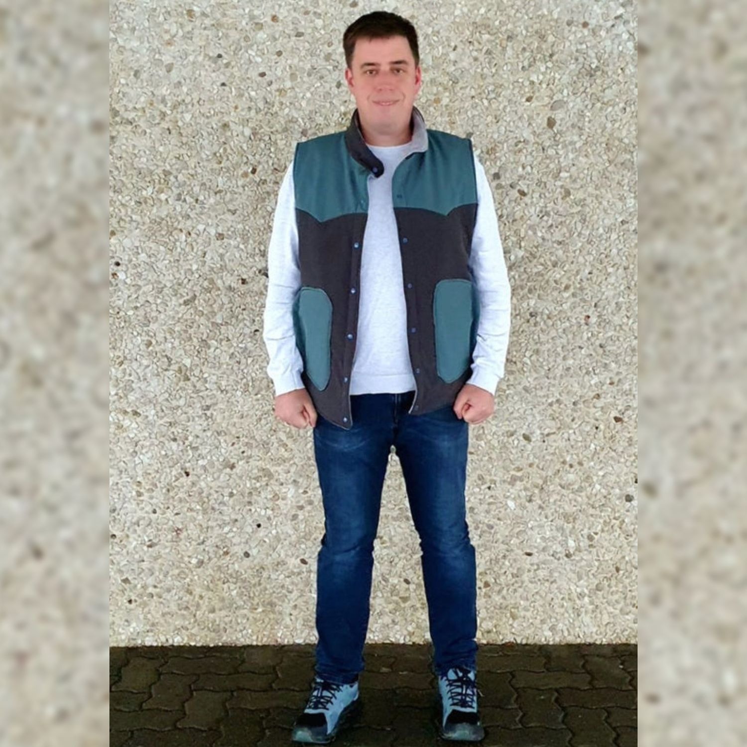- Der Schnitt ist auf Webware ausgelegt. Die Weste besteht aus 3 Schichten: dem Oberstoff möglichst strapazierfähige und wasserabweisende Outdoorstoffe (synthetische Gewebe). Der Isolierung z.B. Volumenvlies für mitteleuropäischen Winter (Thinsulate P80) und dem Futterstoff Wollmischgewebe, Teddy, Fleece, ect.