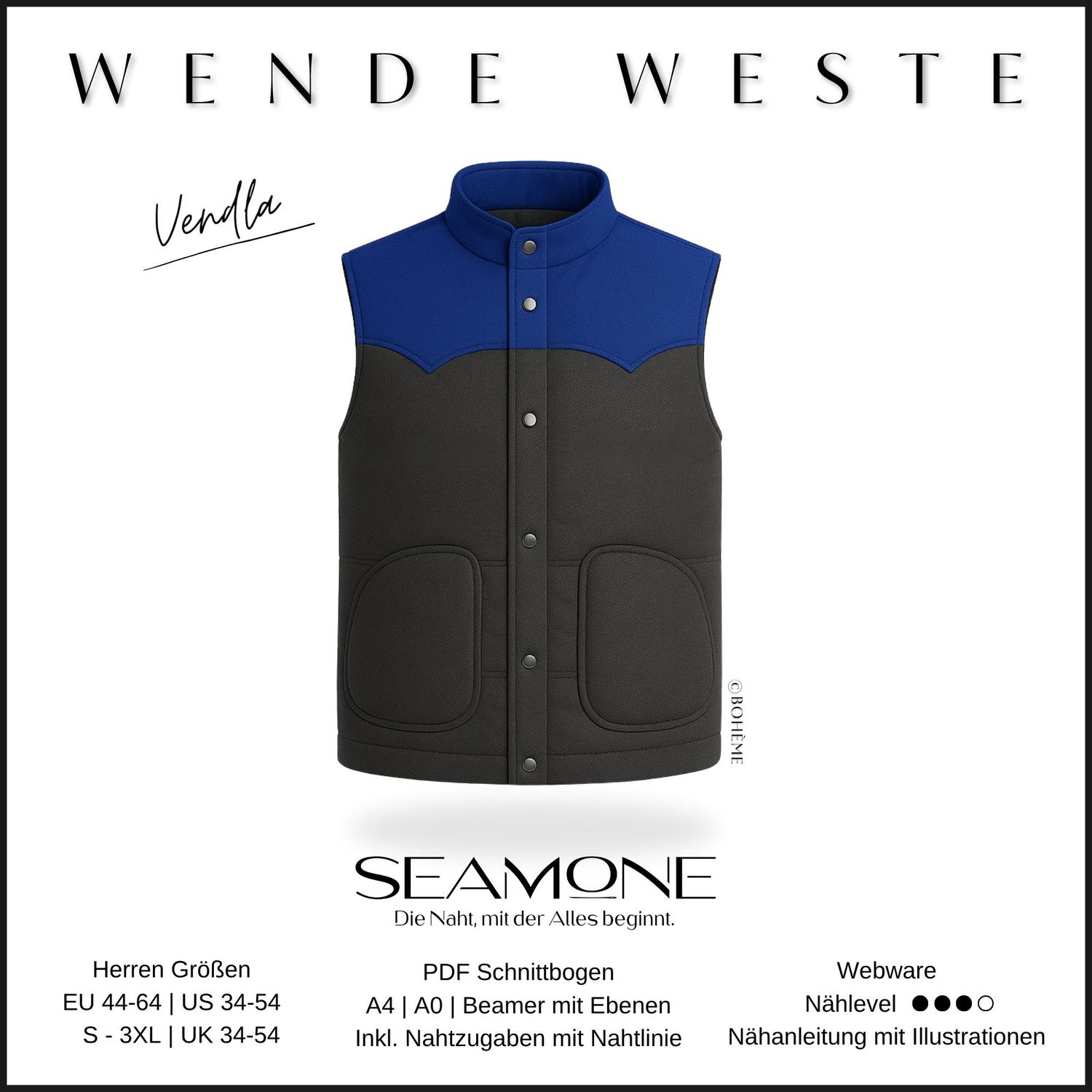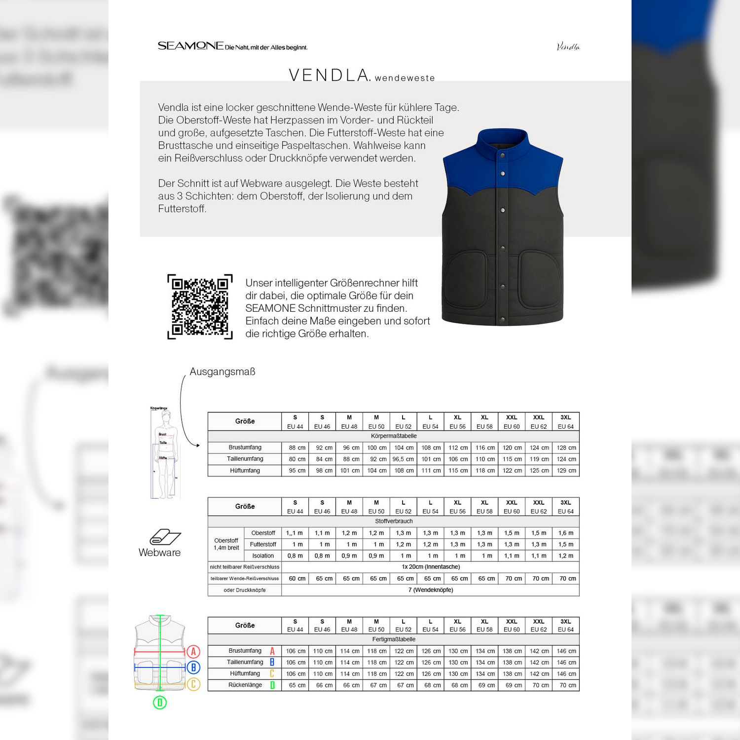 Vendla ist eine locker geschnittene Wende-Weste für kühlere Tage. Die Oberstoff-Weste hat Herzpassen im Vorder- und Rückteil und große, aufgesetzte Taschen. Dekorative Absteppungen werden gesetzt, um die Volumeneinlage zu fixieren. Die Futterstoff-Weste hat eine Brusttasche und einseitige Paspeltaschen. Wahlweise kann ein Reißverschluss oder Druckknöpfe verwendet werden.