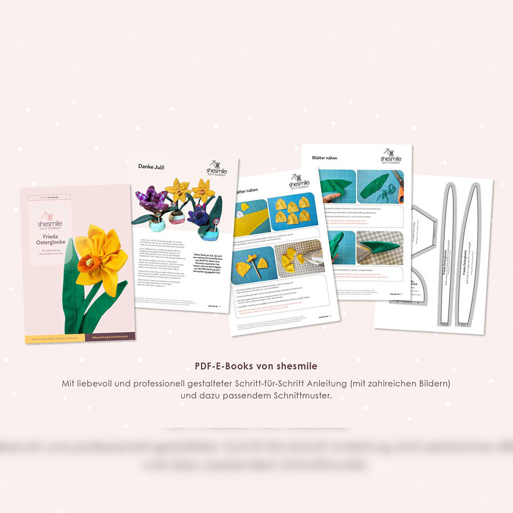 - Nähanleitung und Schnittmuster gestaltet als PDF-E-Book von shesmile für Frieda Osterglocke. Die Narzisse aus Stoff für Allergiker, das Kinderzimmer, Vielreisende, kranke und alte Menschen, schattige Plätzchen oder Pflanzendummies wie mich.
